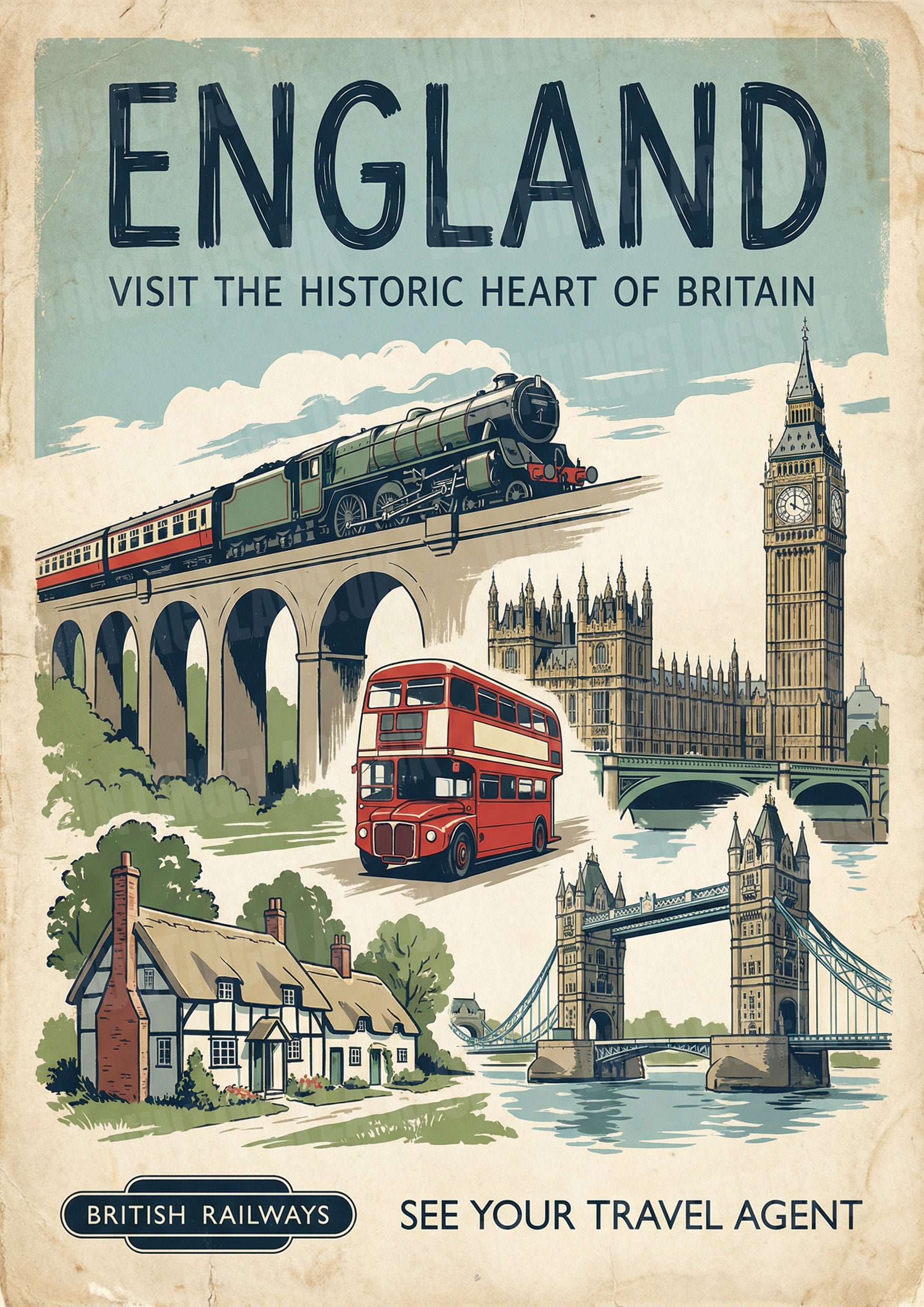 A timeless, romantic tribute to England's enduring charm in classic mid-century British Railways poster style. This evocative A3 artwork weaves together the nation's most beloved landmarks into one sweeping, nostalgic panorama. Dominating the skyline is the majestic Palace of Westminster and Big Ben, its iconic clock tower rising proudly against a soft, cloud-streaked sky. Below, a powerful steam locomotive thunders across a grand multi-arched viaduct, smoke billowing as it carries passengers through the heart of the country.